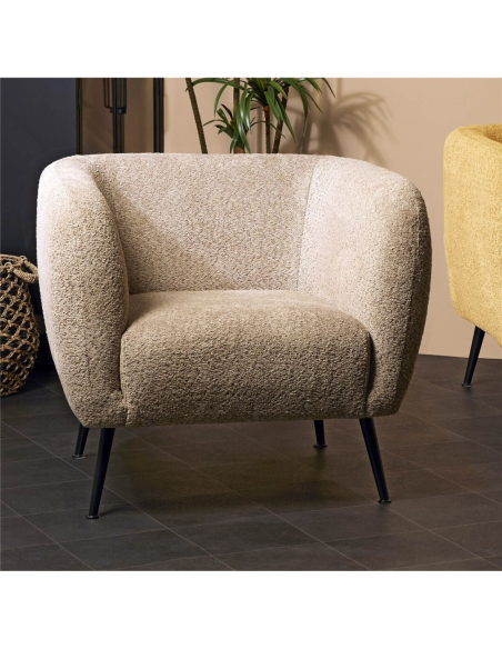 Sillón Buster rizo suave visón, con un respaldar y apoyabrazos a la misma altura, ofrece un aspecto moderno y armonioso. El almohadón acolchonado proporciona un confort excepcional, ideal para largas horas de relax. Tapizado en un elegante color beige, este sillón se integra fácilmente en cualquier estilo de decoración. Las patas elevadas en color negro no solo aportan estabilidad, sino que también añaden un contraste atractivo, elevando el diseño a un nivel contemporáneo. Perfecto para salones, estudios o cualquier rincón que necesite un toque de estilo y confort.
