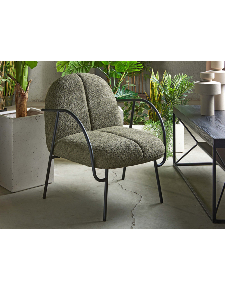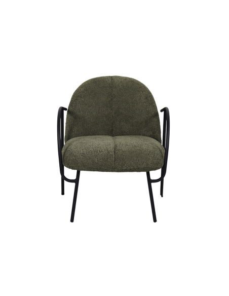 Butaca Badru rizo suave verde, el respaldar curvado, con una costura en el centro, y el asiento con costura central no solo ofrecen un diseño atractivo, sino también un confort excepcional. Los apoyabrazos curvos en color negro añaden un contraste moderno, mientras que las patas elevadas de metal negro aseguran estabilidad y un toque contemporáneo. Perfecta para salones, dormitorios o áreas de descanso, esta banqueta es ideal para quienes buscan un mueble que combine funcionalidad y estética en su decoración.