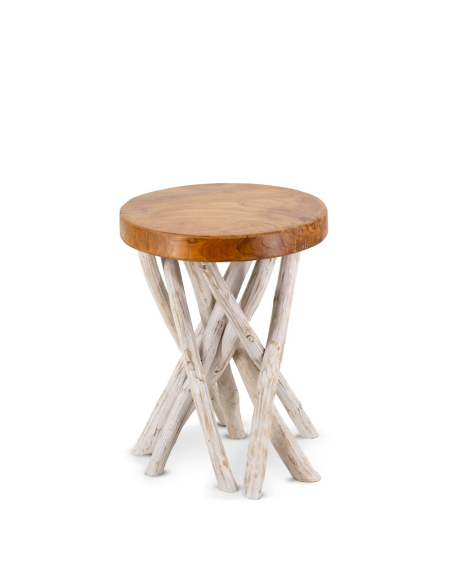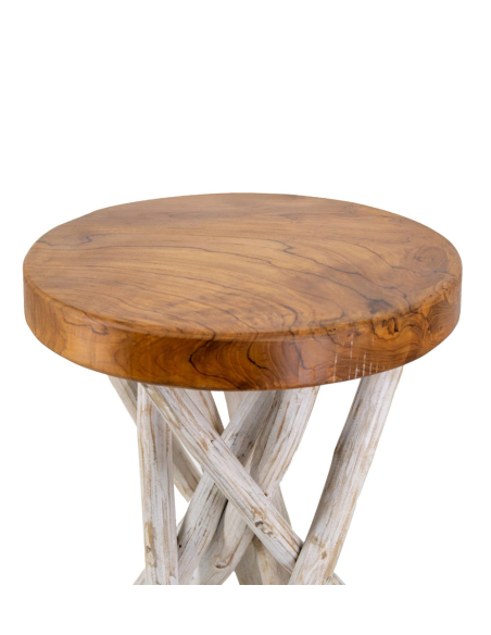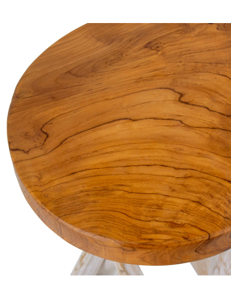 Mesa auxiliar teka redonda, con diseño rústico y encanto natural. Su tapa redonda de madera ofrece un espacio ideal para apoyar objetos decorativos o de uso diario, mientras que su base de troncos entrecruzados en color blanco gastado le da carácter y autenticidad. Perfecta para añadir un toque acogedor a cualquier estancia, esta mesa combina funcionalidad y estilo, resaltando las vetas naturales de la madera y su acabado envejecido.