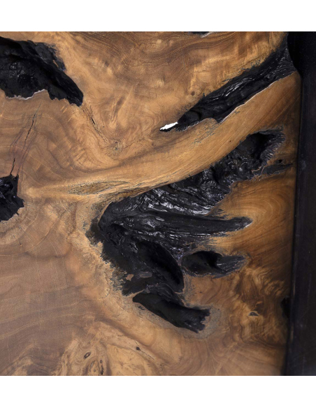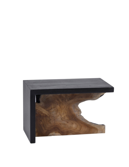 Mesa auxiliar teka raíz, destaca por su originalidad, con una estructura que fusiona lo moderno y lo natural. La parte superior y lateral están hechas de madera recta en color oscuro, brindando una estética elegante y sofisticada. En el centro, una rodaja de tronco de árbol revela la belleza orgánica de la madera, añadiendo un toque rústico y natural. Ideal para salones, recibidores o como mesa auxiliar en cualquier habitación.