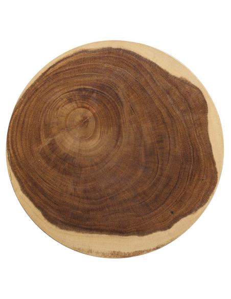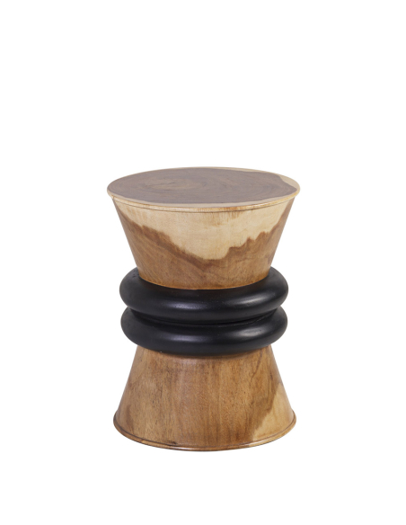 Mueble auxiliar Suar cono, con un rústico y contemporáneo, ideal para quienes buscan un toque exótico en su decoración. La madera, con su beta a la vista, resalta su belleza natural y aporta un carácter orgánico a la pieza. En el centro, dos anillos en color negro añaden un contraste moderno y elegante, destacando aún más el diseño. Perfecta como mesa auxiliar o banqueta, es una opción versátil que puede integrarse fácilmente en salones, comedores o espacios con una estética étnica o Bohemia. Una pieza funcional y de gran impacto visual.