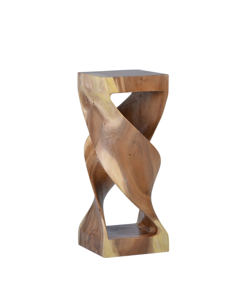 Pedestal cuadrado tronco curvo, esta pieza única y artesanal está tallada a partir de un tronco de madera, lo que le otorga un carácter orgánico y rústico, a la vez que sus acabados delicados y lustrosos resaltan su elegancia y detalle. Con un formato de espiral irregular que añade dinamismo al diseño, este pedestal presenta una base y superficie cuadrada, brindando estabilidad y un estilo contemporáneo. Ideal para exhibir decoraciones, plantas o piezas de arte, este pedestal es perfecto para quienes buscan una pieza decorativa con un toque natural y sofisticado para su hogar o espacio comercial.