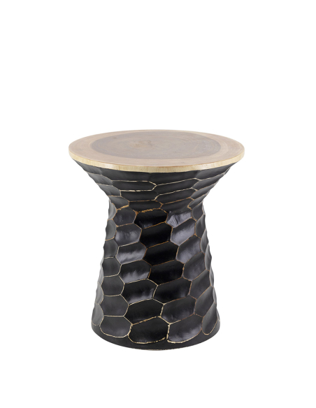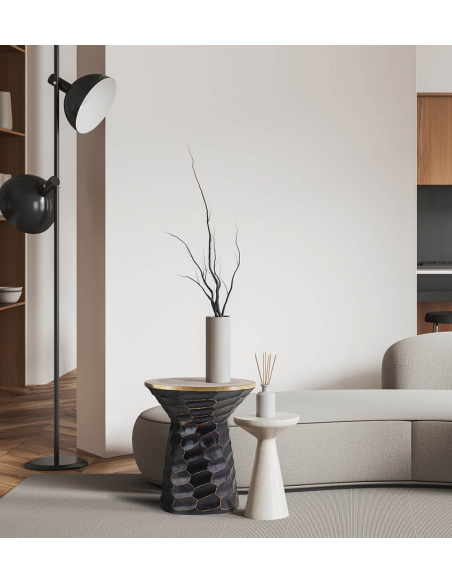 Mesa auxiliar Suar relieve, combina un diseño único y artesanal, con una base cónica que presenta calados detallados en toda su superficie, añadiendo textura y un aire orgánico a la pieza. La tapa de madera resalta las hermosas vetas naturales de la madera, creando un contraste perfecto con la base. El acabado desgastado en el contorno de los calados aporta un toque vintage y rústico, dándole carácter y sofisticación. Ideal para cualquier espacio que busque una pieza de decoración funcional y llena de estilo, esta mesa es perfecta para salones, entradas o habitaciones.