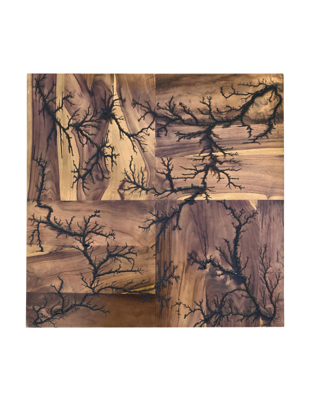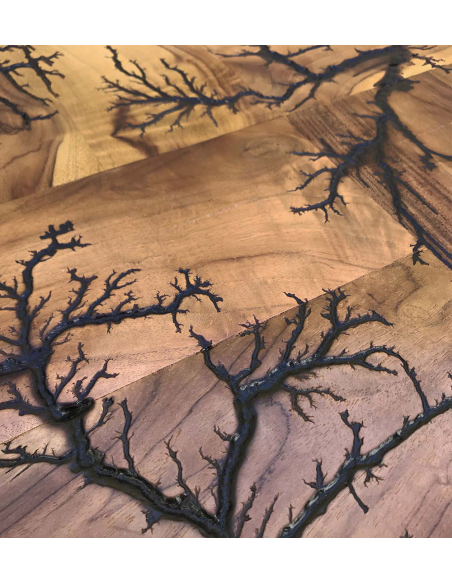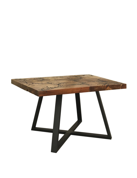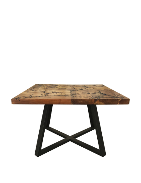 Mesa de centro teka motivo negro, destaca por su superficie única, trabajada con un diseño quemado que simula las venas o raíces de la madera, aportando una sensación orgánica y natural. La estructura de metal cruzada en color negro contrasta perfectamente con la cálida tonalidad de la teka, ofreciendo estabilidad y un toque industrial. Ideal para salas de estar o espacios modernos, esta mesa se convierte en el centro de atención, fusionando lo rústico con lo contemporáneo para crear una pieza de gran carácter y estilo.