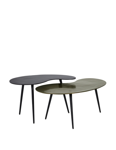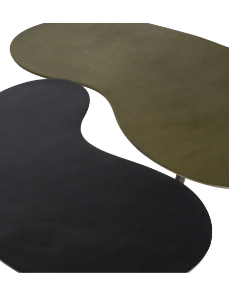 Set 2 mesas auxiliares irregular, destaca por su diseño moderno y funcional. La base en color negro aporta estabilidad y contraste, mientras que las tapas en forma de riñón, una en color negro y la otra en bronce, añaden un toque elegante y distintivo. Con diferentes alturas, estas mesas funcionan perfectamente como un set complementario, adaptándose a diversas necesidades de espacio y estilo. Ideales para salones, entradas o como mesas auxiliares, este set aporta un toque de sofisticación y versatilidad a cualquier ambiente.