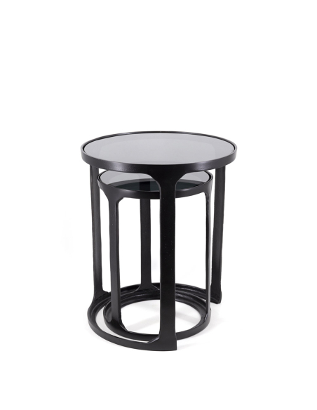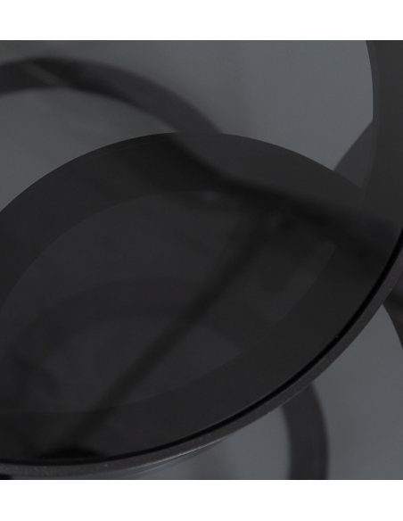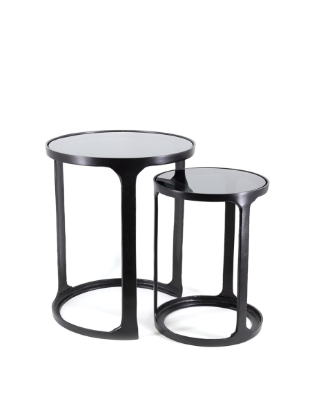 Set 2 mesas auxiliares Antique cristal negro, este elegante set destaca por su diseño contemporáneo y sofisticado. La estructura metálica en color negro proporciona un acabado robusto y moderno, mientras que las tapas de cristal negro esfumado añaden un toque de lujo sutil y elegante. Las mesas vienen en diferentes tamaños y alturas, lo que permite que se encastren perfectamente una dentro de la otra, optimizando el espacio sin perder estilo. Perfectas para salones o espacios pequeños, estas mesas ofrecen funcionalidad y un diseño versátil que se adapta a cualquier ambiente moderno.