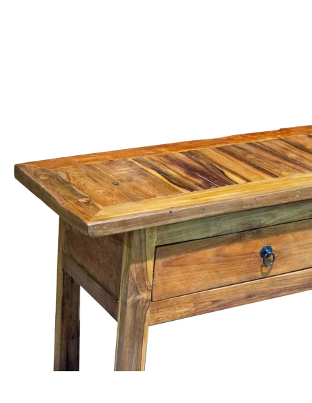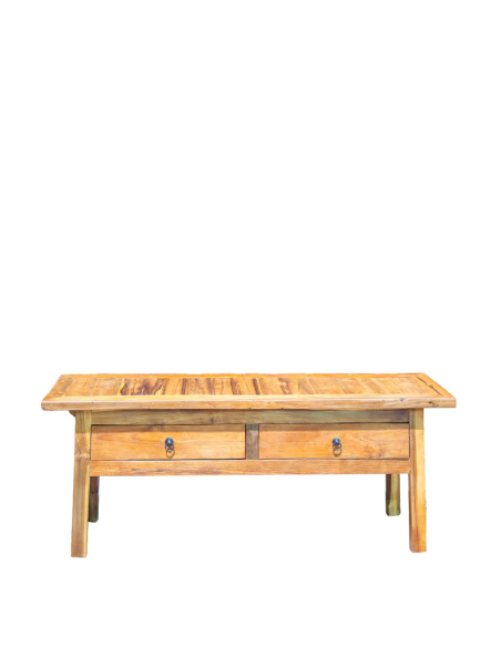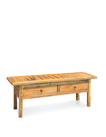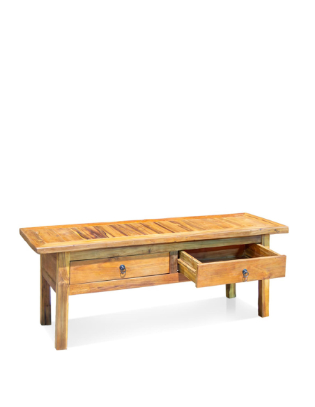 Mesa de centro teka rústica 2 cajones, combina un diseño robusto y elegante, con una tapa construida por múltiples listones de madera colocados en formato vertical, aportando textura y un toque artesanal. En el frente, cuenta con dos cajones espaciosos, ideales para guardar objetos y mantener el área organizada. Las patas elevadas le confieren ligereza visual y facilitan la limpieza del área inferior. Fabricada en madera de teka, es una pieza de alta durabilidad que resistirá el paso del tiempo sin perder su estilo natural. Perfecta para cualquier salón, añade calidez y funcionalidad al espacio.