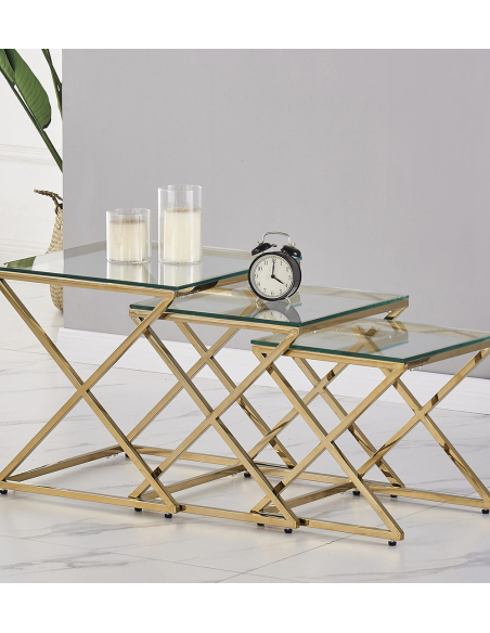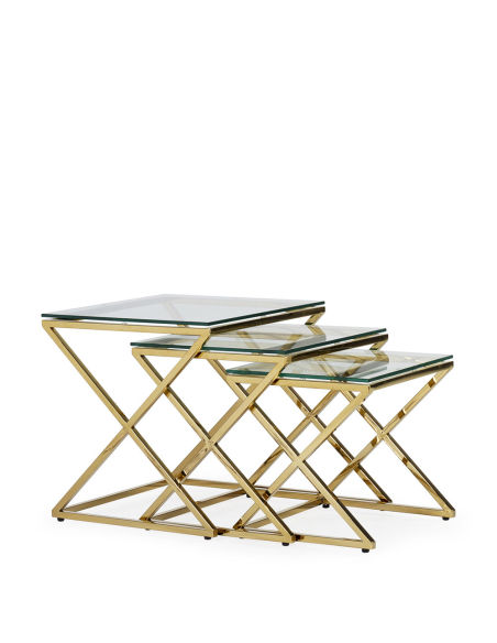 Set 3 mesas auxiliares Berlín, en diferentes alturas, perfectamente combinables para un estilo moderno y elegante. Su estructura de metal en cruz color dorado aporta un toque sofisticado y contemporáneo, mientras que la tapa de cristal translucido añade ligereza y luminosidad a la habitación. Cada mesa está equipada con tapones anti rayas en la base, garantizando su estabilidad y protección del suelo. Este set es ideal para complementar cualquier espacio, ofreciendo funcionalidad y un diseño elegante a la vez.