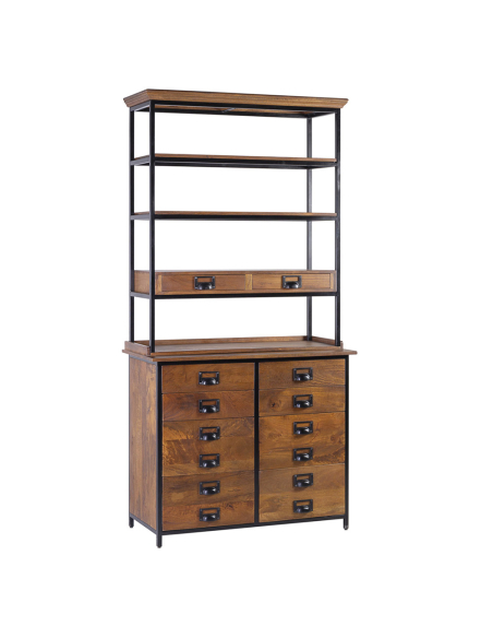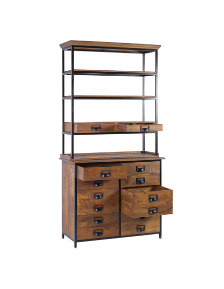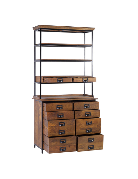Librería Toronto 8+2 cajones 4 huecos, de estilo rústico industrial con estructura de metal robusta y diseño funcional que se adapta a cualquier espacio. Cuenta con tres estantes abiertos en la parte superior, perfectos para exhibir libros, adornos o plantas. En el centro, incorpora dos cajones de madera y en la parte inferior, dispone de ocho cajones adicionales, de los cuales cuatro son dobles, ideales para almacenamiento extra. Todos los tiradores son de metal, aportando un toque industrial auténtico. Las patas metálicas elevadas ofrecen estabilidad y facilidad de limpieza, además de darle un estilo moderno. Esta librería es la combinación perfecta de funcionalidad y diseño, ideal para ambientes contemporáneos con un toque rústico.