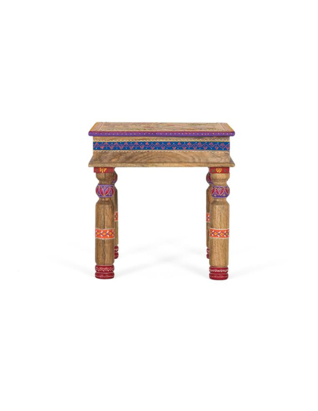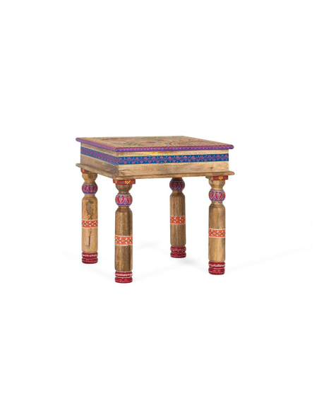 Mesa de rincón Kalena, de madera de mango, pintada a mano con un hermoso diseño oriental. Esta mesa de centro presenta un formato cuadrado con patas torneadas elevadas que no solo le aportan un aspecto elegante y clásico, sino que también ofrecen una estabilidad excelente. La superficie de la mesa está adornada con intrincados detalles pintados a mano que reflejan la riqueza de la cultura oriental, dándole un toque único y auténtico. Es perfecta para añadir un elemento de estilo étnico y funcional a cualquier salón o espacio de estar, proporcionando un lugar ideal para exponer objetos decorativos o disfrutar de un café.