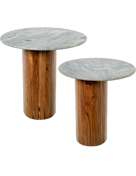 Set de 2 mesas auxiliares mármol y madera, perfecto para complementar cualquier espacio con un estilo elegante y atemporal. Las superficies de mármol, con sus vetas naturales únicas, aportan un aire sofisticado y refinado, mientras que las bases de madera de acacia ofrecen calidez y resistencia. Estas mesas son ideales para colocar lámparas, libros, bebidas o adornos decorativos, añadiendo funcionalidad y estilo a cualquier ambiente. Su diseño combina lo natural con lo moderno, adaptándose perfectamente a espacios contemporáneos o rústicos.
