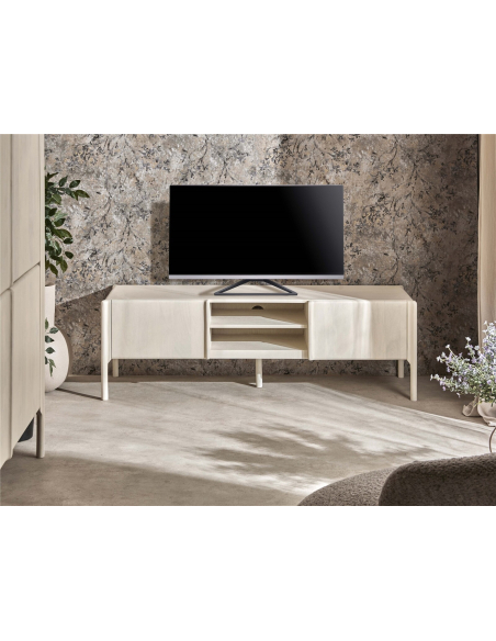 Mueble TV Ares mango blanco, su acabado blanco aporta luminosidad y amplitud al espacio, mientras que sus líneas rectas y depuradas le otorgan un estilo minimalista y elegante. El mueble cuenta con un amplio espacio de almacenamiento, con dos puertas laterales y una sección central abierta con dos estantes, ideal para colocar dispositivos multimedia, consolas de videojuegos, libros o elementos decorativos. Los sutiles tiradores, integrados en el diseño, mantienen la estética limpia y despejada del mueble. La madera de mango, con su veta natural y su tono claro, añade un toque de calidez y autenticidad a tu sala de estar.