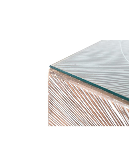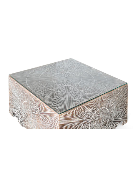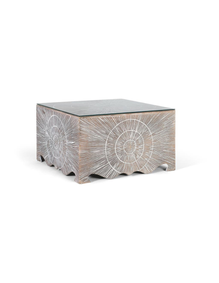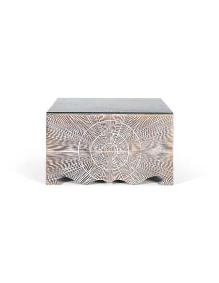Mesa de centro cuadrada líneas y círculos blanco, su estructura de madera de mango presenta un fascinante acabado con líneas blancas finamente grabadas o pintadas sobre un fondo marrón/natural, creando un hipnótico patrón de círculos concéntricos o líneas radiales. Una tapa de cristal protege la superficie y añade un toque práctico. El diseño juega con el contraste entre la calidez de la madera y el grafismo de las líneas blancas, generando una pieza con gran impacto visual. La base, posiblemente con un borde inferior ondulado, añade un detalle extra de originalidad. La tapa de cristal facilita la limpieza y permite apreciar el diseño inferior. Perfecta para salones de estilo bohemio, ecléctico, contemporáneo o con un toque artístico. Esta mesa de centro no solo es un lugar donde apoyar tus cosas, sino también una pieza de conversación que aporta textura, diseño y un carácter único a tu espacio.