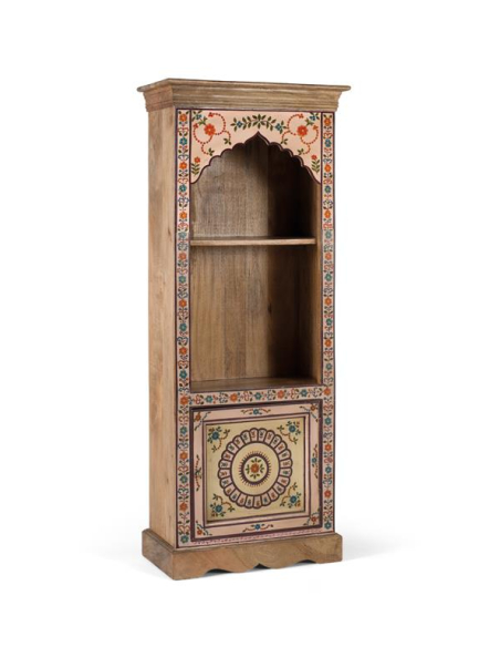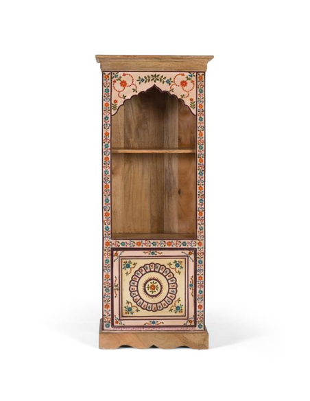 Librería alta flores, lleva la calidez de la madera de mango a tu casa con un trabajo pintado a mano que mezcla cenefas florales en tonos vivos y un frente superior con arco decorativo. Su diseño estrecho y vertical aprovecha el espacio: módulo abierto con balda fija para libros y objetos que quieras lucir, y compartimento inferior con puerta (decorada con un medallón floral) para guardar lo que prefieras fuera de la vista. La moldura superior, el zócalo recortado y el acabado natural ligeramente decapado realzan la veta, haciendo que cada pieza sea única. Ideal para salón, recibidor o dormitorio y perfecta en estilos boho, mediterráneo o rústico-chic. Cuidado sencillo: limpiar con paño suave y seco; evita productos abrasivos y la exposición directa al sol o a la humedad. Llega lista para usar.