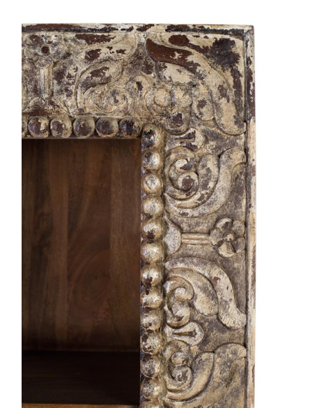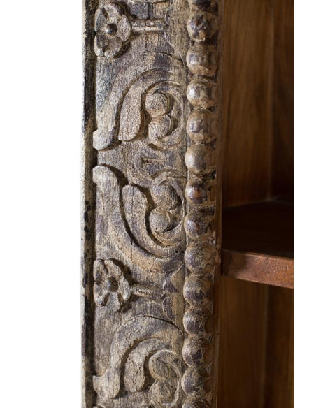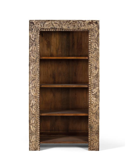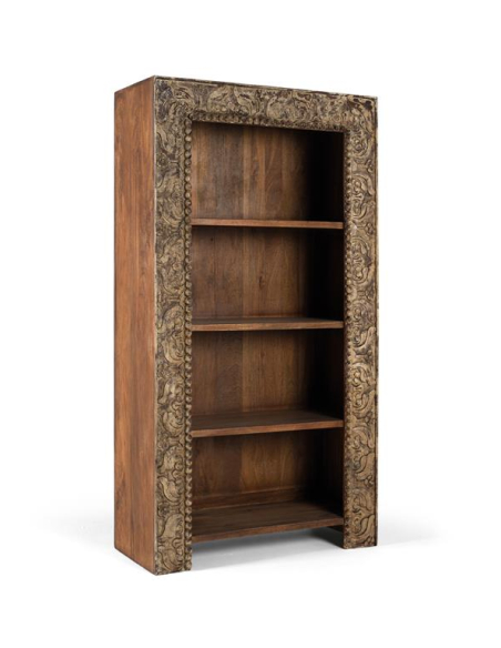 Librería rústica frente tallado con estantes, reúne funcionalidad y carácter: el frente tallado enmarca cuatro estantes abiertos y un acabado envejecido que resalta nudos y vetas. El resultado es una pieza con presencia, ideal para quienes quieren exhibir y ordenar a la vez. En el living aloja libros, velas y objetos de viaje; en el home office organiza carpetas y cajas sin perder encanto; y en el comedor luce vajilla y cerámica como vitrina abierta. Su formato vertical suma altura al ambiente y el diseño abierto mantiene la ligereza visual. Ideal para espacios que buscan calidez, elegancia y un toque étnico, esta pieza destaca por la belleza de la madera y la riqueza del trabajo tallado.