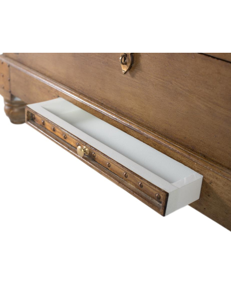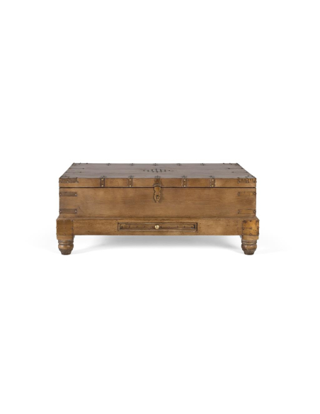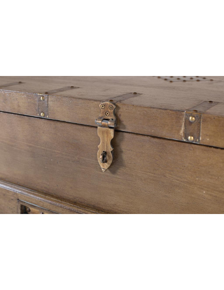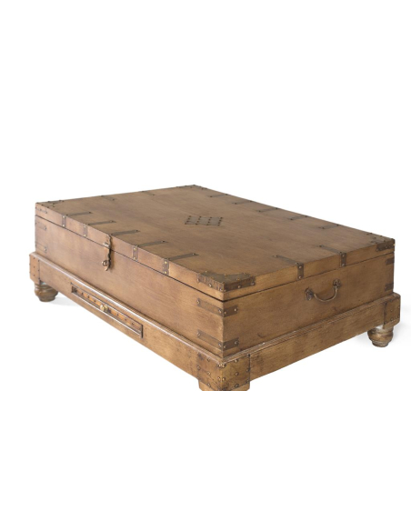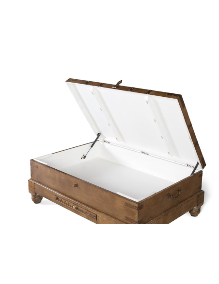 Mesa de centro herrajes rústicos, de espíritu viajero, esta mesa tipo baúl suma personalidad al living con su acabado natural, herrajes metálicos vistos y patas torneadas. La tapa superior se abre para revelar un amplio espacio de guardado ideal para mantas, revistas o juegos, mientras que el tirador frontal y las asas laterales completan su look vintage. Funciona como centro de reunión frente al sofá y como solución de almacenamiento oculta, manteniendo el área despejada sin resignar estilo. Combínala con sillones neutros o cuero para destacar su carácter.