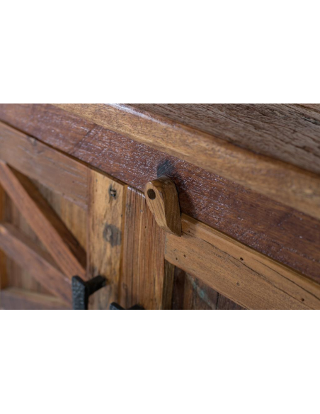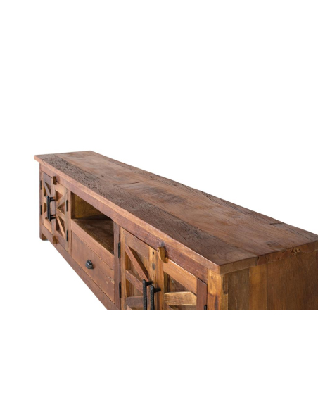 Mueble de TV Obertura rústico, pensado para durar y lucirse: estructura de madera reciclada en tonos avellana, frentes con diseño de crucetas y herrajes metálicos que refuerzan su estética de taller. Al centro, un estante abierto con pasacables mantiene ordenados los dispositivos, mientras que la gaveta y las puertas laterales guardan controles, cables y accesorios fuera de la vista. Funciona igual de bien en livings amplios como en salas familiares; su largo generoso sostiene pantallas grandes y deja superficie para decorar con libros, plantas o velas. La textura de la madera aporta calidez instantánea frente al sofá.