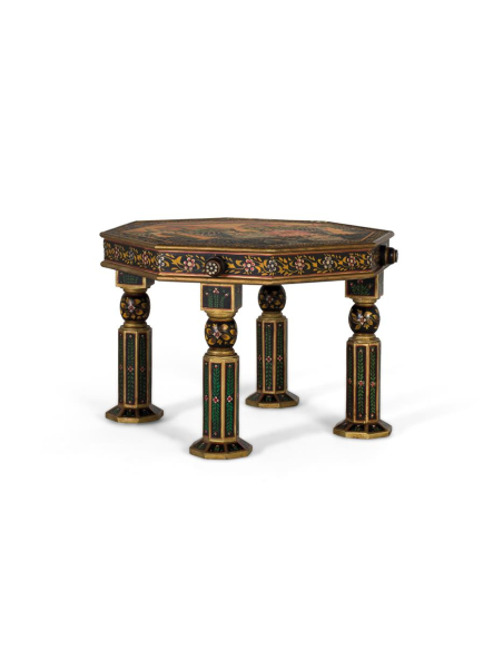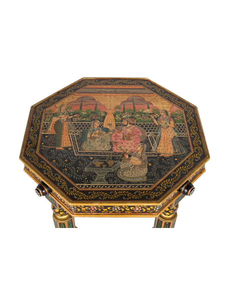 Mesa de centro tapa pintada colores, una explosión de arte para tu living. Esta mesa de centro presenta una tapa pintada a mano con escenas y motivos florales de inspiración artesanal, enmarcados por un borde en tonos dorados y negros. La estructura de madera de mango asegura solidez, mientras las patas torneadas aportan gesto clásico. Es ideal para salas que buscan un acento vibrante: combina con sillones neutros, alfombras claras y cojines en tonos que repitan su paleta. Además de soporte para bandejas y libros, es pieza conversacional por excelencia.