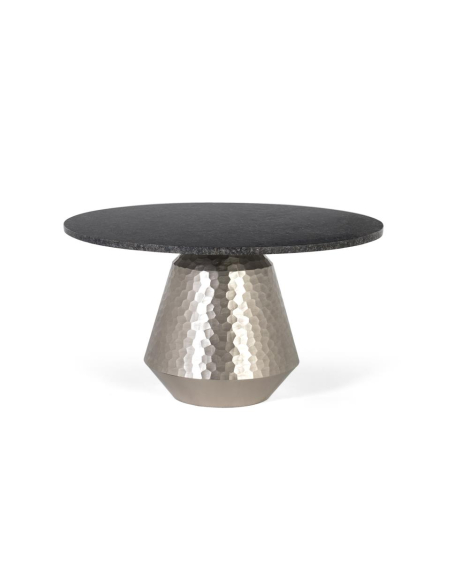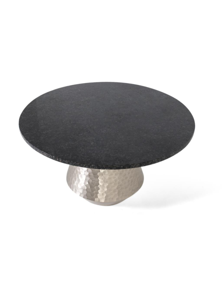 Mesa de centro Intermezzo plateada, carácter contemporáneo en clave monocroma. La base cónica de aluminio martillado aporta relieve artesanal y presencia, mientras que la tapa circular negra suma profundidad y un look urbano. Su altura es ideal para ubicar frente al sofá en livings modernos o como mesa de apoyo en recepciones y oficinas creativas. Combina muy bien con tapizados claros, pieles y madera natural para un contraste equilibrado.