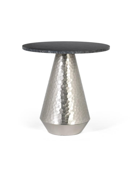 Mesa de centro Intermezzo plateada alta, proporciones estilizadas para ambientes que buscan presencia sin recargar. La base de aluminio martillado sube en un cono robusto que sostiene una tapa de mármol negro/gris (look piedra) de borde afinado. La combinación de materiales nobles garantiza durabilidad y un impacto visual elegante. Funciona como mesa central en livings amplios, acompañando sofás modulares, o como pieza protagonista en salas de espera premium.