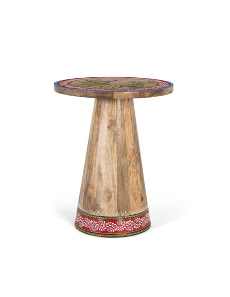 Mesa alta Pavo real, su base cónica de madera maciza de mango en acabado natural sostiene una tapa redonda pintada a mano con un pavo real rodeado de motivos florales y cenefa en tonos rojos, verdes y azules. El dibujo, de inspiración folk-india, convierte la superficie en un pequeño lienzo decorativo perfecto para destacar una lámpara, una planta o apoyar copas y libros. Gracias a su silueta esbelta, se integra sin recargar espacios pequeños: junto al sofá como mesa auxiliar, en el recibidor como pedestal, o en el dormitorio como mesita decorativa. Combina con interiores boho chic, eclécticos y mediterráneos, y suma textura natural y arte sobre madera sostenible de alta durabilidad.
