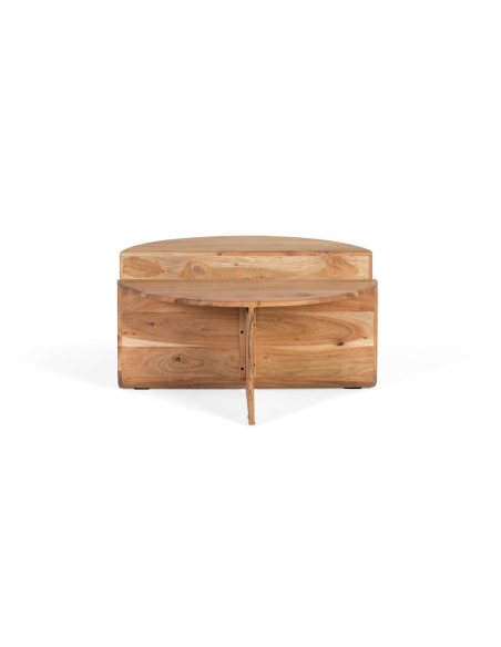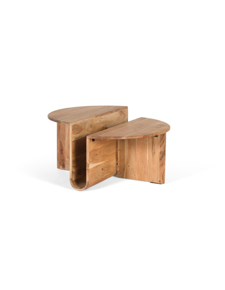 Mesa de centro con curva central, en madera de acacia que encajan entre sí mediante una original curva central tipo “U”. Puedes usarlas juntas para formar una elipse amplia frente al sofá o separarlas como mesas auxiliares en ambos laterales. El acabado natural y las líneas redondeadas suavizan la zona de estar, mientras que la madera aporta resistencia para el uso diario. Perfectas para salones contemporáneos, mid-century cálidos y espacios de estilo japandi que buscan formas orgánicas, orden visual y versatilidad.