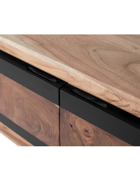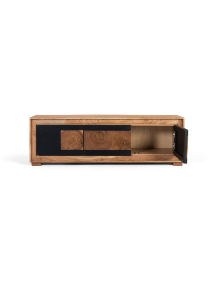 Mueble de TV Trémolo combinado, equilibra lo natural y lo urbano con maestría. La estructura exhibe un delicado marco en tono avellana que abraza frentes negros mate y paneles con cortes transversales de madera, donde se aprecian los anillos de crecimiento como una obra de arte. Ese juego de materiales convierte al centro multimedia en el protagonista del living, ya sea en interiores modernos, nórdicos o industriales. Por dentro ofrece compartimentos amplios con balda para organizar consolas, decodificadores y accesorios, y la tapa superior brinda apoyo estable para pantallas generosas sin recargar el ambiente. Su silueta baja ayuda a “abrir” visualmente el espacio y permite decorar con cuadros, lámparas o plantas sin competir por la atención. Si buscas orden, estilo y presencia en una sola pieza, esta base de TV en natural y negro es la respuesta.