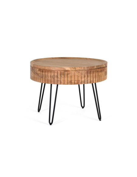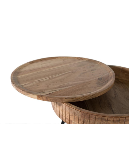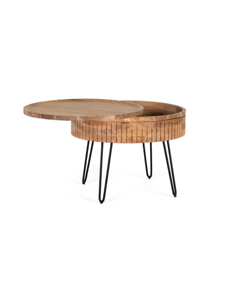Mesa de centro tapa giratoria, su tapa circular gira con un movimiento suave y revela un compartimento oculto ideal para mandos, cargadores, auriculares o golosinas de medianoche. La veta marcada aporta calidez inmediata, mientras las patas metálicas tipo hairpin le dan un aire ligero, casi flotante, que despeja visualmente la sala. El formato redondo facilita la circulación y arma una zona de encuentro amigable alrededor del sofá. Es perfecta para livings pequeños o multifuncionales porque suma almacenamiento sin sumar volumen, y se integra de maravilla con textiles claros, alfombras de yute o cuero y lámparas de pie. Una mesa organizadora que convierte el orden en parte del estilo.