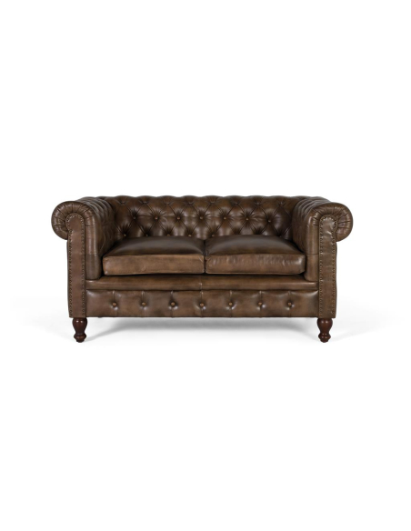 Sofá Glissando Chester dos plazas, perfecto cuando el espacio es valioso pero no quieres resignar presencia. La piel auténtica en tono marrón, el capitoné artesanal y la base botoné recrean la atmósfera de los clubes ingleses, mientras sus proporciones equilibradas garantizan comodidad real para dos personas. Funciona de maravilla como pieza principal en salones compactos o como complemento de un sillón individual en ambientes más grandes. Viste bien con mesas de hierro y madera, alfombras de lana o patrones geométricos; siempre se siente cálido y elegante.