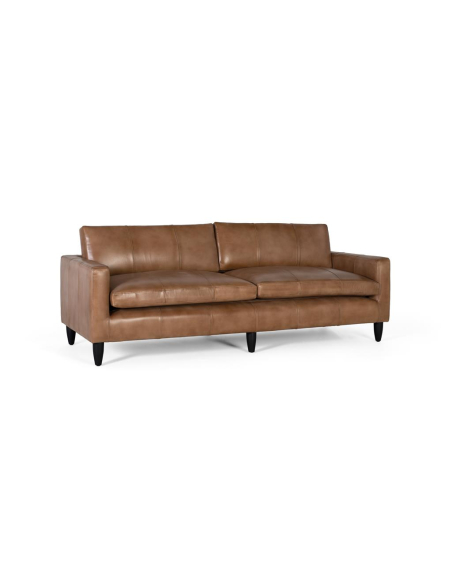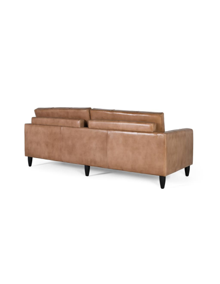 Sofá tres plazas piel suela, combina líneas limpias con cojines mullidos y patas cónicas que estilizan el conjunto. La superficie suave al tacto y las costuras marcadas le dan un aire mid-century contemporáneo que nunca cansa. Su paleta cálida se lleva de maravilla con maderas claras, mármol, latón o negro mate. Funciona como base neutra para jugar con almohadones, mantas y arte en la pared; cambia el clima del ambiente con muy poco. Un imprescindible si buscas comodidad diaria y estética pulida.