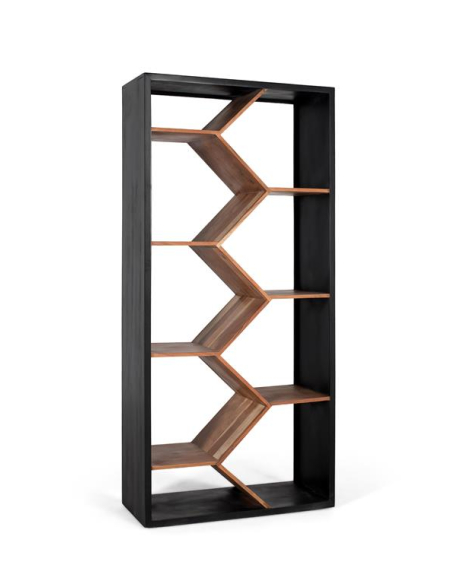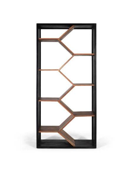 Librería Panal, introduce dinamismo al muro con un juego de estantes en zigzag que evoca celdas de panal. El contraste entre el marco oscuro y las superficies en tono natural resalta la geometría y convierte a los libros y objetos en parte de la composición. Su estructura en madera aporta firmeza y una presencia elegante. Ideal para living, despacho o estudio, facilita crear rincones de exhibición con plantas, arte y colecciones. Más que un mueble de apoyo, es un recurso decorativo que organiza y decora a la vez, aportando verticalidad y carácter a ambientes modernos o industriales.