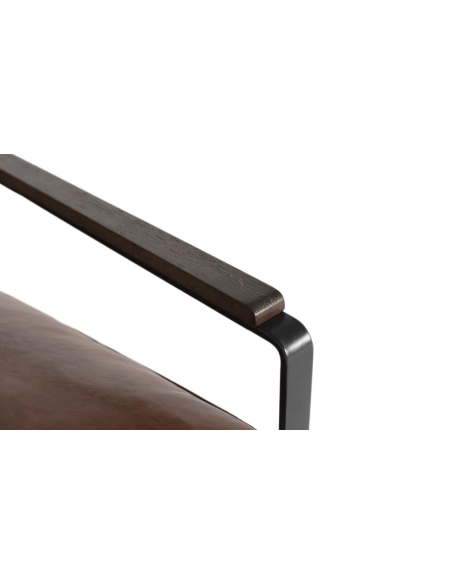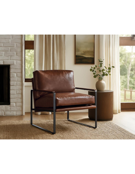 Sillón piel marrón con metal, carácter industrial con confort premium. La piel marrón de tacto suave se combina con laterales y apoyabrazos metálicos de inspiración aeronáutica, con remaches vistos que refuerzan el look. El asiento profundo y los cojines mullidos aseguran apoyo correcto y una sensación envolvente. Ideal para espacios modernos o lofts que piden piezas con personalidad. Brilla junto a mesas auxiliares de hierro y lámparas de pie, y resiste el uso diario sin perder estilo.