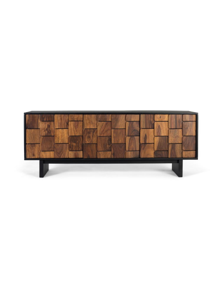 Mueble de TV combinado cuadrados, un mix material lleno de carácter, cuerpo en negro profundo y puertas revestidas con bloques de madera maciza formando un mosaico tridimensional. El contraste entre mango y sheesham aporta matices chocolate y miel que enriquecen el conjunto. Pensado para el uso diario, integra pasacables y baldas para organizar consolas y dispositivos, dejando el frente limpio. Su silueta baja y sólida acompaña TV de distintos formatos y suma un toque moderno-industrial al salón.