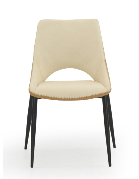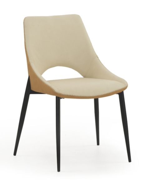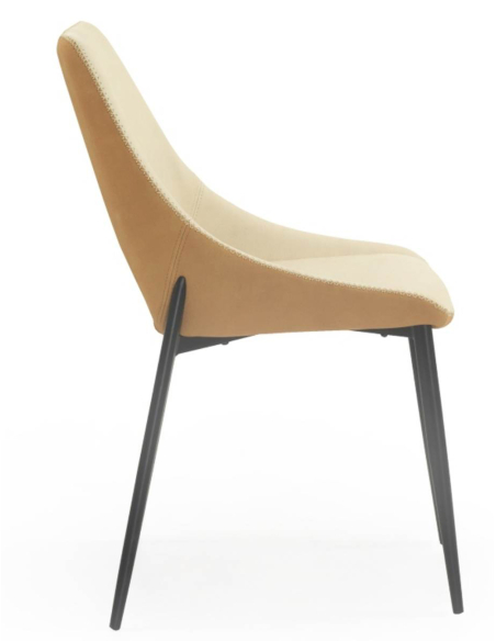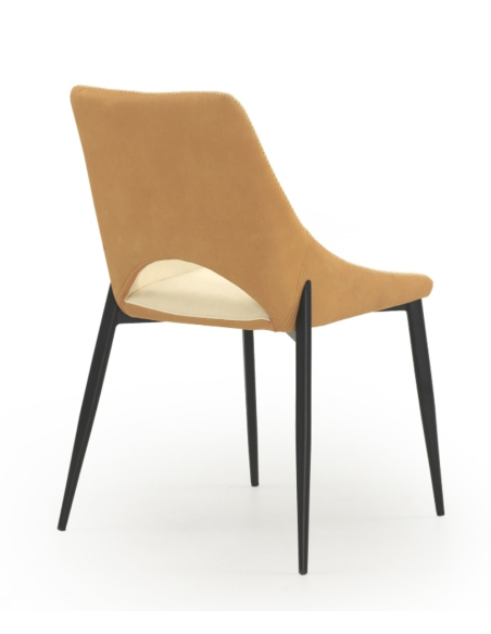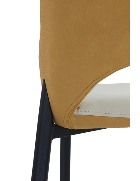 Set Driza 4 sillas comedor tapizadas bicolor, cada silla presenta una elegante silueta con un característico hueco en el respaldo, tapizada en símil piel de alta calidad. La combinación bicolor, con el interior en beige y el exterior y ribete en un cálido tono mostaza, junto con el pespunte decorativo perimetral, crea un look muy actual y sofisticado. Diseñadas para la comodidad, estas sillas ofrecen un asiento y respaldo ergonómicos, perfectos para disfrutar de largas sobremesas. La estructura de patas metálicas cónicas en color negro aporta estabilidad y un toque contemporáneo ligero. Este set es la elección ideal para comedores modernos o contemporáneos que buscan sillas con personalidad y fáciles de mantener. Aportan confort, un diseño llamativo y una combinación de colores muy atractiva. Requiere montaje sencillo de patas.