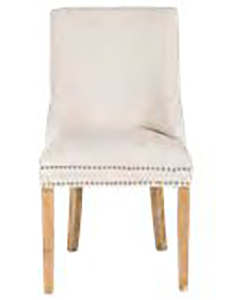 Descubre la gran variedad que ofrecemos en sillas de comedor, sillones y butacas en todos los estilos, donde encontrarás esta silla de comedor Lourdes en madera de roble color natural, tapizada en tela de lino color beige, con detalle de tachuelas color plata alrededor del respaldo y en la parte delantera del asiento, con detalle de anilla en la parte de atrás del respaldo para facilitar su movimiento, consiguiendo un aire elegante y diferente. Una silla de estilo clásico con la que dar un aire distinguido y elegante a tu salón o como butaca auxiliar para cualquier rincón.