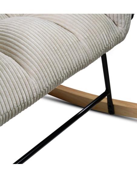 Sillón balancín Kaiho beige, con un diseño moderno y una base de metal en color negro que proporciona estabilidad y un toque industrial. Las patas de madera curvas añaden elegancia y calidez al conjunto. El asiento, respaldo y apoyabrazos están acolchonados y tapizados en un textil suave que invita a la relajación. El diseño balancín ofrece un confort adicional, permitiendo balancearse suavemente para mayor descanso. Ideal para crear un rincón de confort en salones, terrazas o espacios al aire libre, este sillón es perfecto para quienes buscan estilo y funcionalidad en un solo mueble.