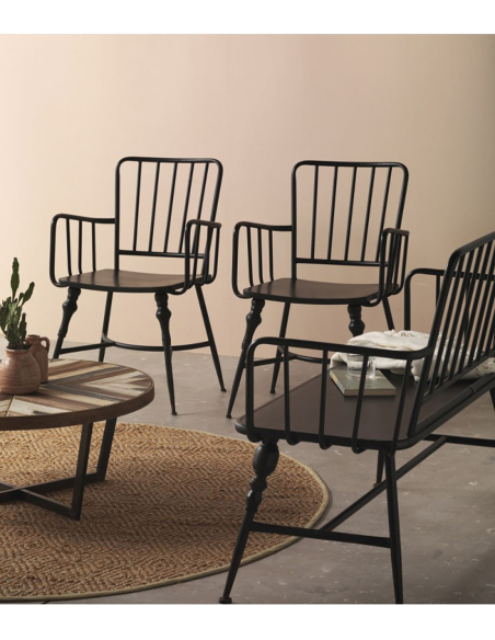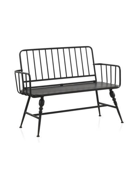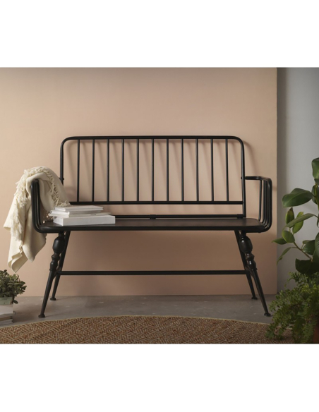 Sofá Levante estructura metal, su estructura está realizada íntegramente en metal con un acabado negro mate, presentando un respaldo de barrotes verticales y reposabrazos integrados. Las patas delanteras torneadas añaden un detalle clásico inesperado. Este banco metálico de dos plazas es una pieza singular que combina líneas industriales con detalles clásicos. Su diseño abierto y ligero es ideal para recibidores, terrazas cubiertas, porches o como asiento alternativo en salones de estilo industrial, vintage o ecléctico. Su asiento plano permite añadir cojines para mayor confort. El sofá Levante es una pieza duradera y con una fuerte personalidad estética. Su acabado mate le confiere un aspecto moderno dentro del estilo industrial, creando un punto focal interesante y funcional.
