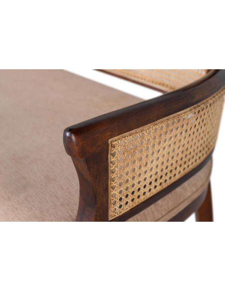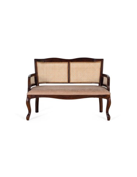 Sofá 2 plazas Rondó, mezcla lo clásico y lo fresco. Su estructura de acacia en tono nogal y las patas curvas aportan elegancia, mientras el respaldo y los apoyabrazos con esterilla le dan ligereza visual y ventilación. El asiento tapizado en beige suma confort y facilita combinarlo con cojines en distintos colores. Perfecto para livings pequeños, salas de estar, galerías o un recibidor amplio; también luce en rincones de lectura junto a una lámpara de pie y una mesa auxiliar. Un diseño cálido, refinado y fácil de integrar.