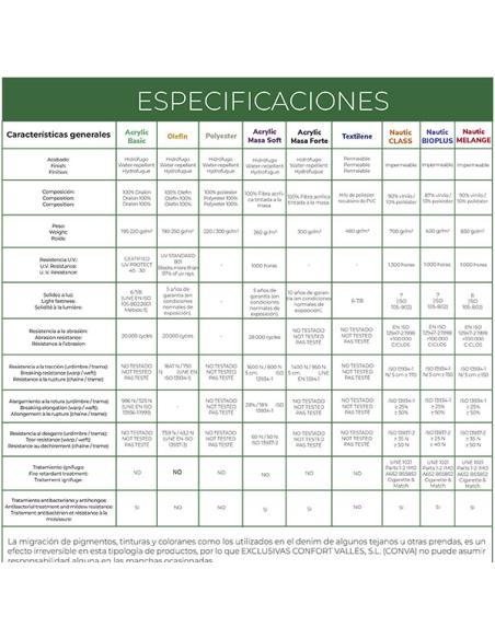 - Olefin 250 gr - 100% olefin - Para exterior e interior, con tratamiento repelente a los líquidos y a la suciedad, garantía de 5 años a la solidez del color.