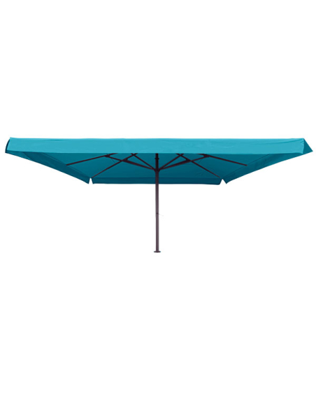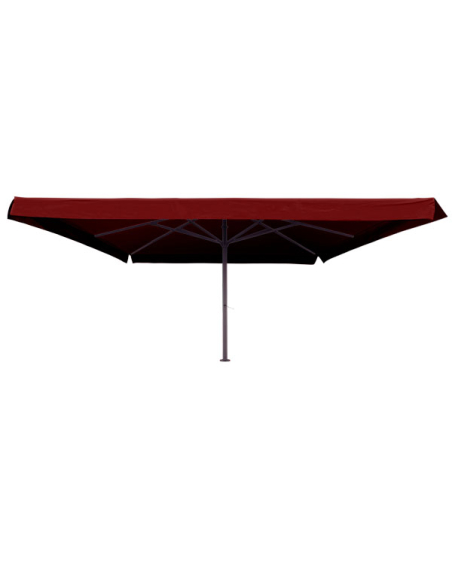Parasol aluminio Giant, de 5 x 5 m. Sistema de apertura telescópico mediante cremallera metálica, mástil de aluminio estriado 86 mm diámetro, 8 varillas aluminio de 35 x 20 mm con refuerzo interior. Acople metálico de fijación con tapa incluido. Faldón y personalización opcional (suplemento).