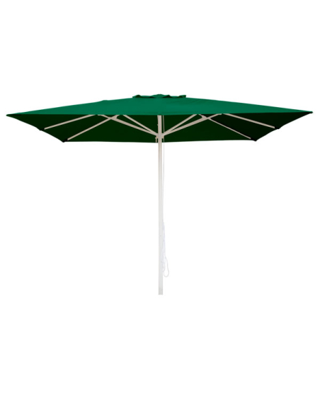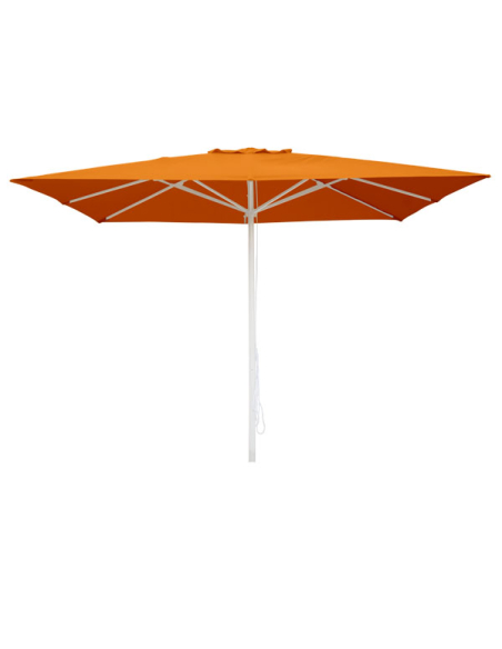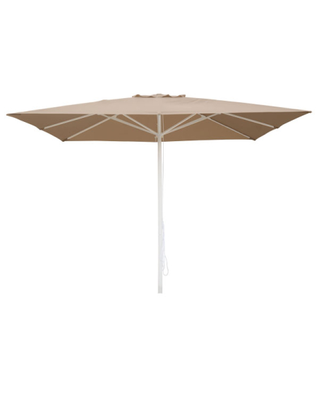 Parasol aluminio ZOCO de 2 x 3 m, mástil de Ø 48 mm, con montura de aluminio y 8 varillas de acero de 12 x 18 mm. Sistema de apertura por polea y bloqueo de seguridad con pasador. Con salida de vientos. Faldón opcional.