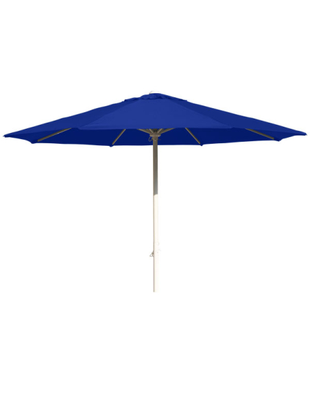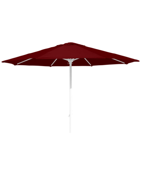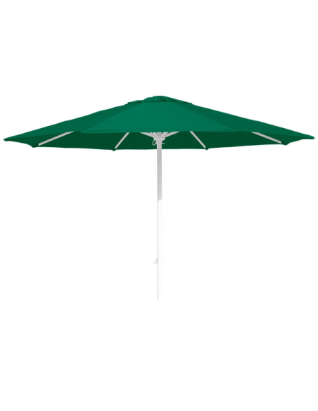 Parasol RUEDO de aluminio Ø 3 m, con montura de aluminio y varillas de acero, con tela disponible en varios acabados y colores poliéster o acrílico. Si estás pensando en comprar parasoles para terraza de bar o restaurante, es muy importante invertir en un producto de alta durabilidad y con acabados resistentes y de fácil mantenimiento. Este parasol está fabricado con materiales resistentes al entorno y de fácil mantenimiento, además, gracias a su sistema de salida de vientos, te garantiza una gran estabilidad para un servicio de terraza óptimo. Apertura con sistema de polea y bloqueo de seguridad con pasador.