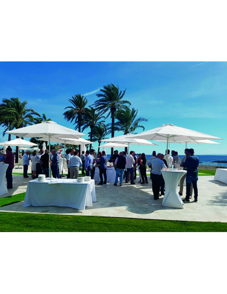 Parasol PLAZA de aluminio de 3 x 3 m, con montura de aluminio y varillas de acero, con tela disponible en varios acabados y colores poliéster o acrílico. Si estás pensando en comprar parasoles para terraza de bar o restaurante, es muy importante invertir en un producto de alta durabilidad y con acabados resistentes y de fácil mantenimiento. Este parasol está fabricado con materiales resistentes al entorno y de fácil mantenimiento, además, gracias a su sistema de salida de vientos, te garantiza una gran estabilidad para un servicio de terraza óptimo. Apertura con sistema de polea y bloqueo de seguridad con pasador.