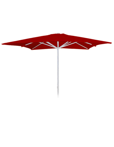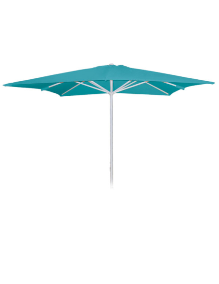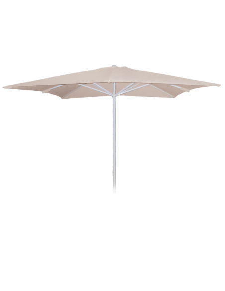 Parasol PLAZA aluminio de 3 x 3 m, mástil de Ø 48 mm, con montura de aluminio y 8 varillas de acero de 12 x 18 mm. Sistema de apertura por polea y bloqueo de seguridad con pasador. Freno de la cuerda y bisagras PVC. Con salida de vientos. Faldón opcional.