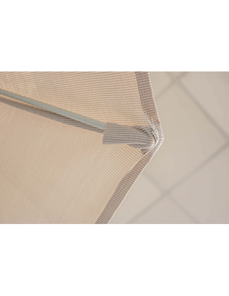 Materiales: Textilene beige, montura de aluminio, varillas de fibra de vidrio. Mástil pintado en blanco con pintura epoxy.