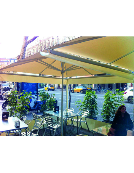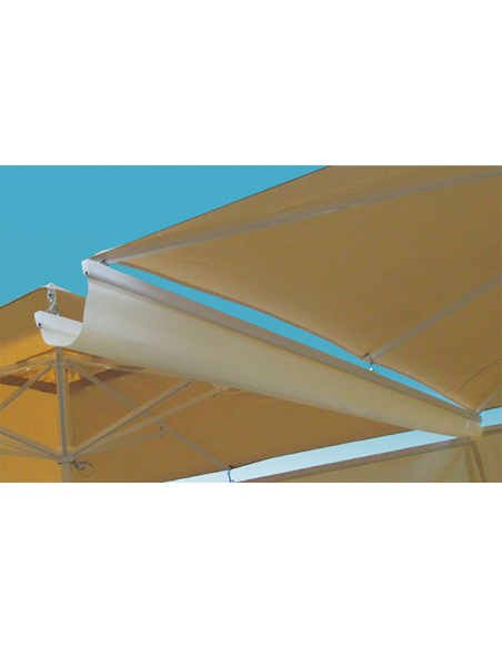 Canal unión lluvia parasol, una pieza indispensable para terrazas con grandes parasoles. Este accesorio canaliza el agua de las lluvias hacia los exteriores de los parasoles, minimizando la caída de agua en la zona interna donde se realiza el servicio de terraza. Fabricado en PVC en color crudo, incluye sus correspondientes perfiles lacados en blanco, disponible para los parasoles de 3x3 m o 4x4 m, y en otros tamaños y colores bajo pedido.