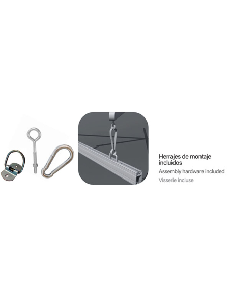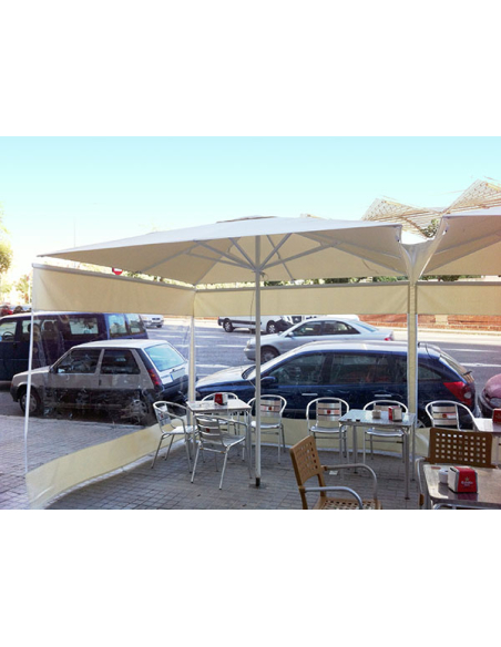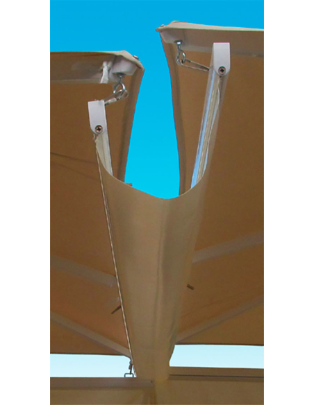 Canal unión lluvia parasol, en cuatro tamaños disponibles, 2, 3, 4 o 5 m, con perfiles de aluminio lacados en blanco y herrajes incluidos. Tejido PVC en color crudo. Disponible en otros colores y tamaños bajo pedido.