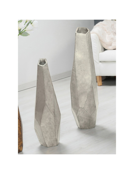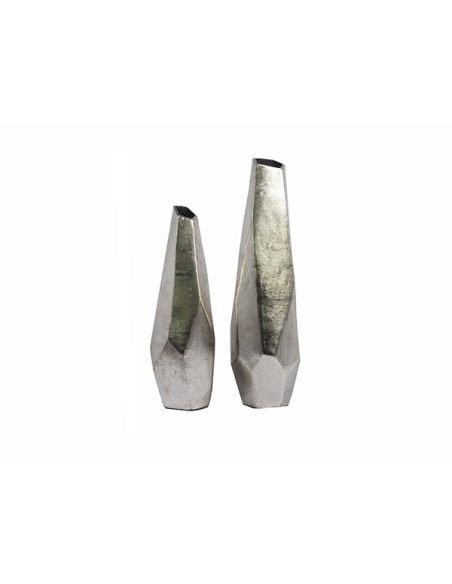 Set 2 vasijas Askar plata. Con un diseño angulado muy original, estos jarrones plateados son perfectos para colocar en el suelo por su altura. Ideal para ramas o flores de gran tamaño en espacios elegantes.