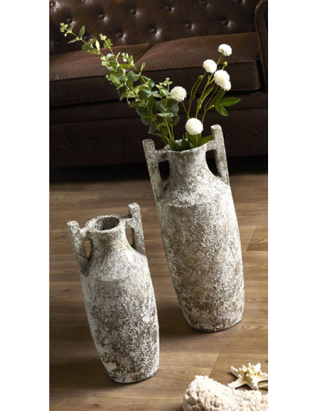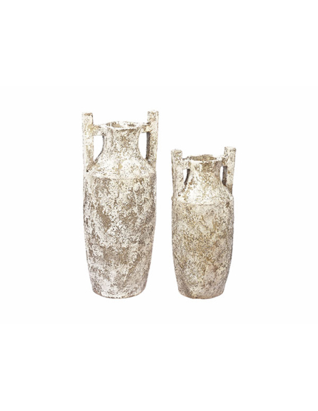 Set 2 vasijas Dava beige. De diseño rústico y con efecto envejecido en su exterior, los jarrones Dava son ideales para espacios rústicos y clásicos. Por su tamaño, son ideales para colocar grandes ramos de flores o ramas decorativas.