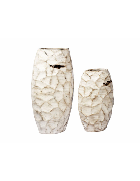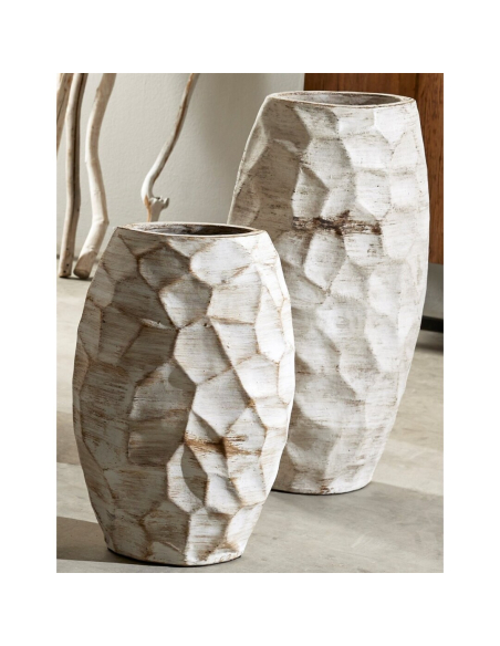 Set 2 vasijas Pleny blanco. Con un diseño ovalado y una trama geométrica, los jarrones Pleny son perfectos para espacios elegantes y rústicos. Destaca su textura, en terracota blanca y con efecto envejecido.